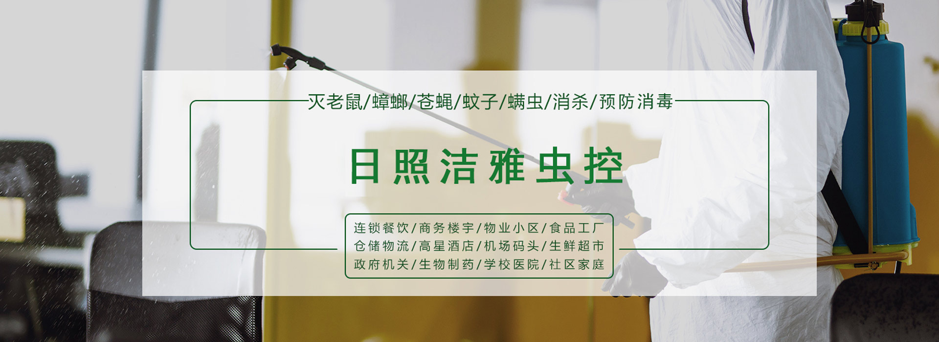 日照潔雅有害生物防治有限公司專(zhuān)業(yè)從事有害生物防治及滅殺、預(yù)防性消毒、冷鏈?zhǔn)称废镜葮I(yè)務(wù).為賓館、酒店、飯店、寫(xiě)字樓、大中型餐廳、食品加工廠(chǎng)、醫(yī)院、小區(qū)、學(xué)校、商場(chǎng)、娛樂(lè)場(chǎng)所等各類(lèi)場(chǎng)所提供有害生物綜合治理服務(wù)及預(yù)防服務(wù)。
